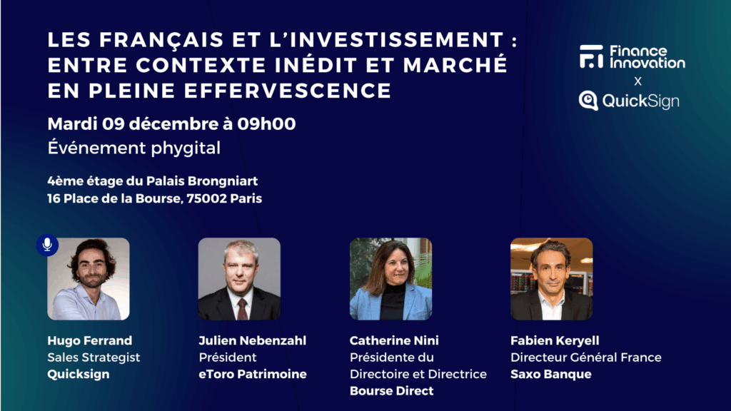 Over the past ten years, the financial savings rate of French households has more than doubled. In a context marked by inflation and significant uncertainty, how can this accumulated savings be converted into meaningful and effective investment? To provide concrete insights, Quicksign and Finance Innovation are hosting a morning event at the Palais Brongniart on December 9, bringing together three leading players in the sector.